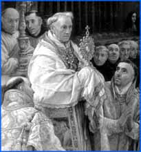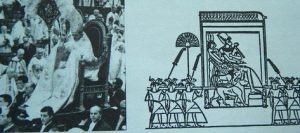 Cerkev se večinoma drži vladarjev. Začelo se je s tem, da je cesar Konstantin (+337), ki ga cerkev še vedno časti in ki velja za »svetega«, utrl pot cerkvi kot edini državni veri (od leta 380). Koncil v Niceji, ki je sprejel za cerkev še danes zavezujoč nauk o domnevni trojici, je vodil Konstantin, koncil pa je tudi pod njegovim direktnim vplivom. Znani preučevalec religij Hubertus Mynarek pojasnjuje: »Na Nicejski sinodi leta 325 se je cesar pojavil v sončni obleki Mitre, navdušeno slavljen s strani škofov (citat iz predavanja na temo “Spart euch die Kirche”, ki je bilo dne 1.3.2004 v Augsburgu). Konstantin je bil nasilni in vojaški vladar, ki je ubijal tudi konkurente, ubil je npr. svojo ženo Fausto in sina Crispusa. Tudi papeži so se pustili – podobno kot egiptovski faraoni – častiti kot »predstavniki Boga« in se stoletja dolgo pustili nositi na nosilih. Papeževa nosila so bila od Janeza Pavla II. iz praktičnih razlogov modernizirana. Od takrat naprej so nosila in nosilce zamenjali s »papamobili« iz Daimler-Benza z neprebojnim steklom in telesnimi stražarji. Levo papež Pavel II. na nosilih in njegovi nosači, |